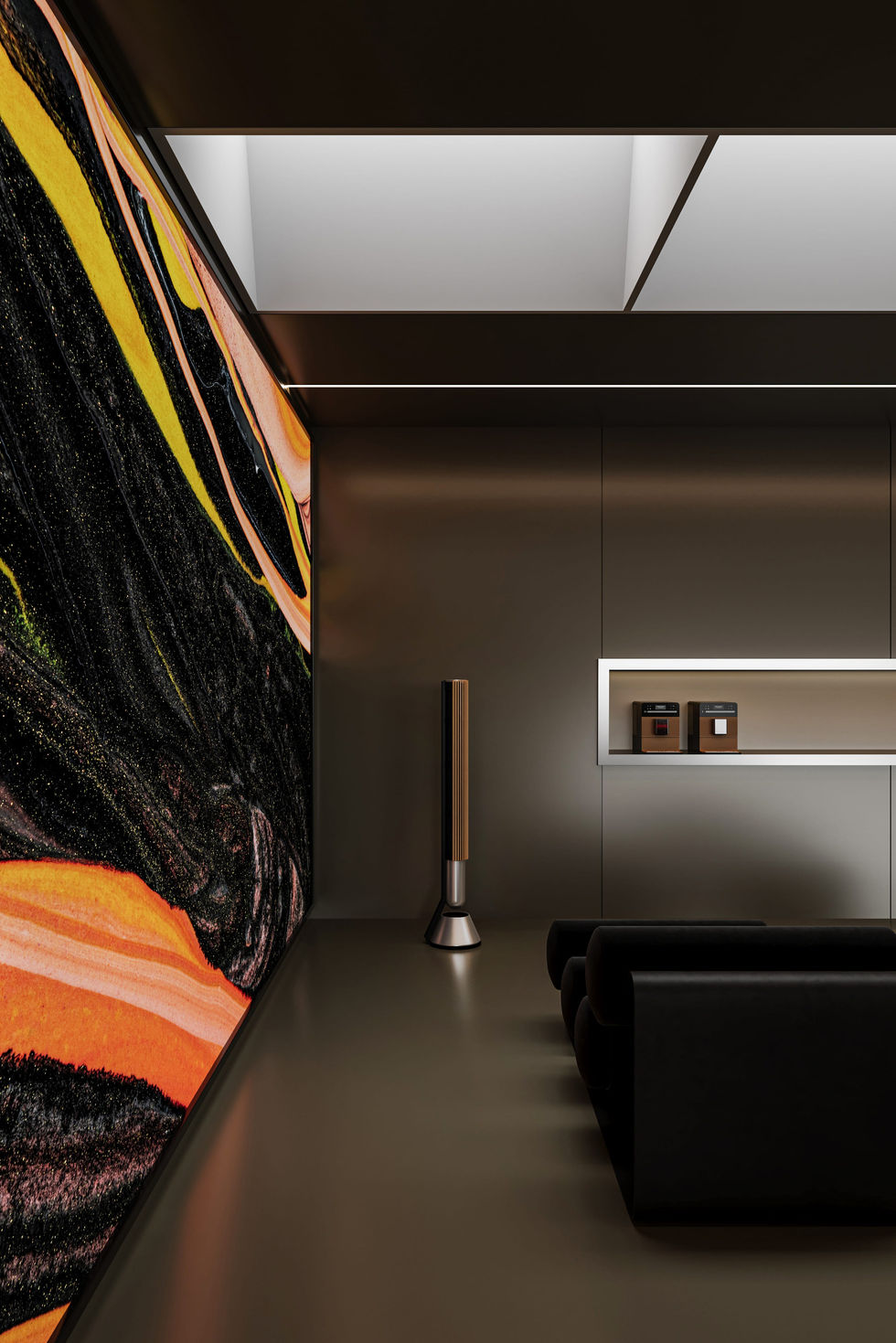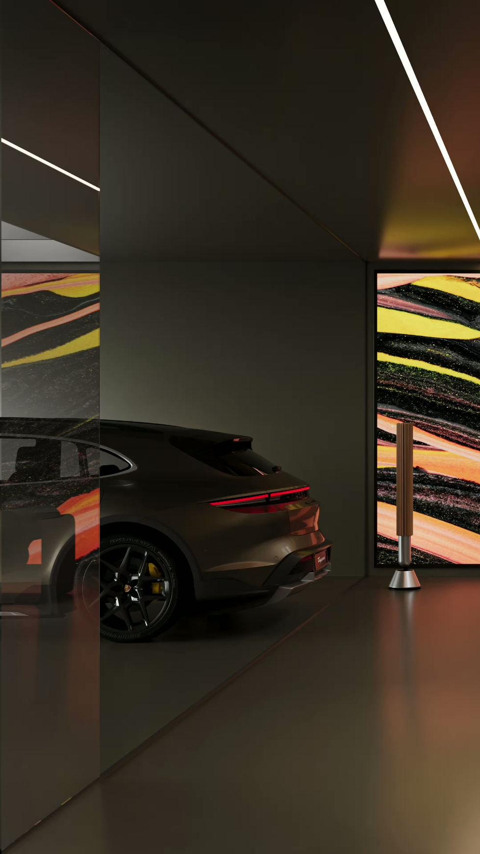 The spatial organization prioritizes comfort, clarity of movement, and an intimate one-to-one experience. Continuous material coherence strengthens visual unity, allowing surfaces, lighting lines, and transitional elements to flow seamlessly throughout the environment. The expansive LED display animates the room with dynamic digital art pieces, while a premium audio system enhances the multisensory impact of the moment. Together, these components establish a staged presence in which the vehicle becomes the architectural focal point of the controlled setting.